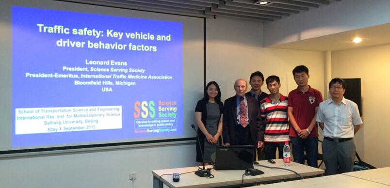 随后,下午4:00 –6:00在国际交叉学院(IRC)308会议室Evans博士为到场师生做了题为“Traffic Safety: Key Vehicle and Driver Behavior Factors”的学术报告。在报告中,Evans博士从交通安全的历史出发,结合自身广泛的研究经历,探讨了车辆本身及参与其中的人的行为因素对交通死亡率的影响。他还比较了不同的主动及被动安全技术应用对降低交通死亡率的作用,包括未来以无人驾驶为代表的新技术应用可能带来的影响。他所有的研究结论都是基于数十年的交通安全数据的分析结果,通过发达国家的经验和教训,他提出未来中国可以借鉴和学习的地方。Evans博士的报告精彩纷呈,同时又深入浅出。会后,Evans博士还回答了多个师生提出的问题,赢得在场师生的高度评价。最后Evans博士与师生合影留念。