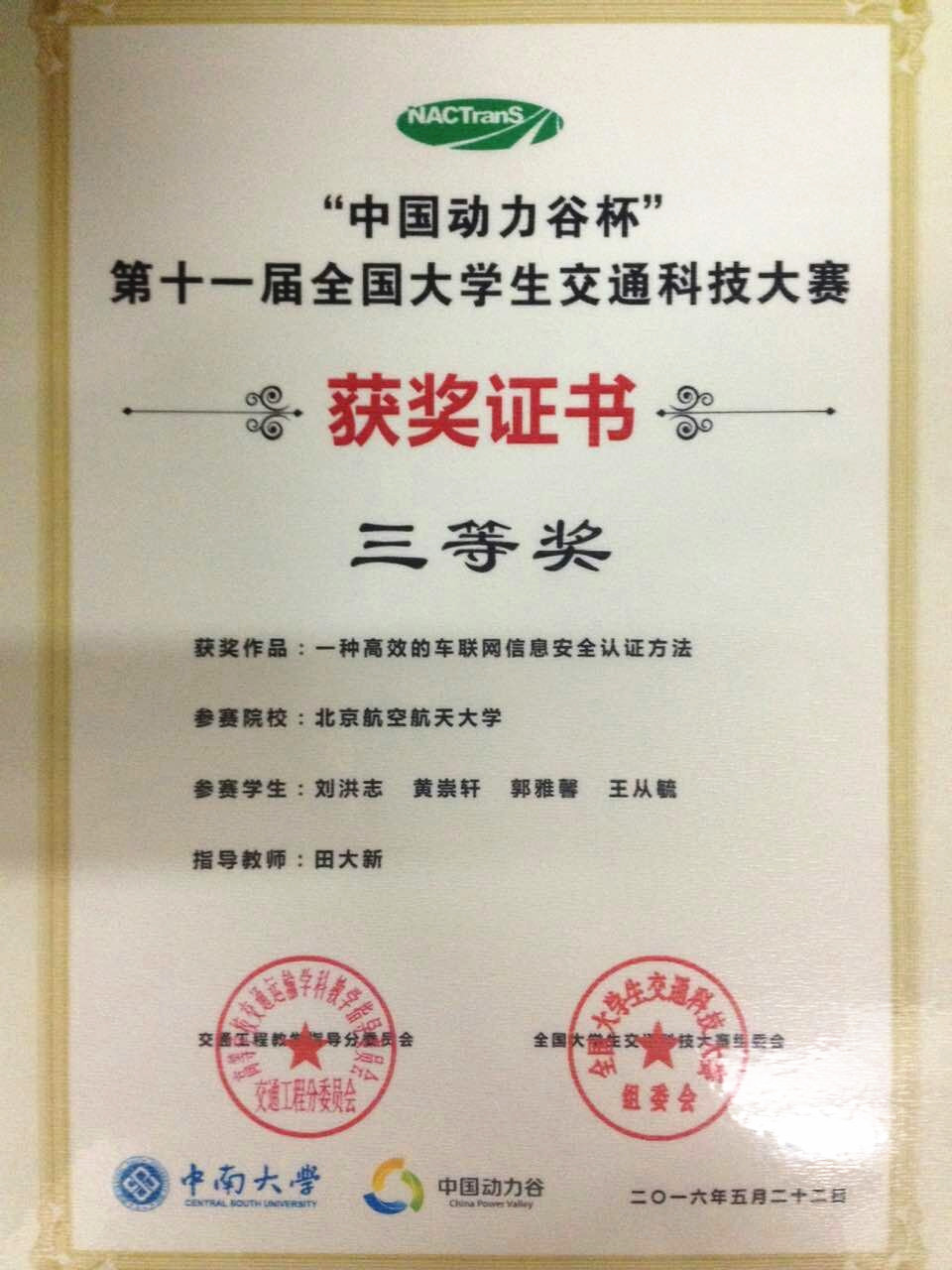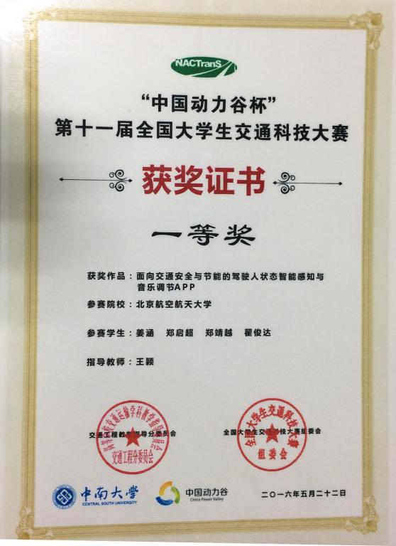 经充分准备,两支队伍均在5月21日的决赛答辩现场表现优异。凭借项目新颖的创意和答辩时的精彩表现,由王颖副教授指导,郑靖越、翟俊达、姜涵、郑启超四名大三学生完成的“面向交通安全与节能的驾驶人状态智能感知与音乐调节App”作品以B组(交通信息工程及控制竞赛组)第一名的优异成绩进入特等奖复议,将作品展示给所有专家评委及参赛选手,充分展现了我校学生的风采,并最终获得大赛一等奖(全国仅八项一等奖,特等奖空缺)。同时,由田大新副教授指导,刘洪志、黄崇轩、郭雅馨、王从毓四名本科生完成的“一种高效的车联网信息安全认证方法”作品获得大赛三等奖,为我校再添殊荣!