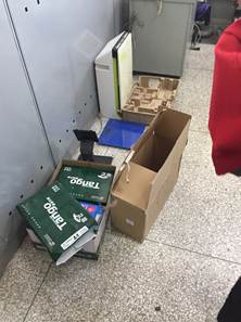 西配楼502堆放纸箱和杂物    西配楼406堆放纸箱和杂物