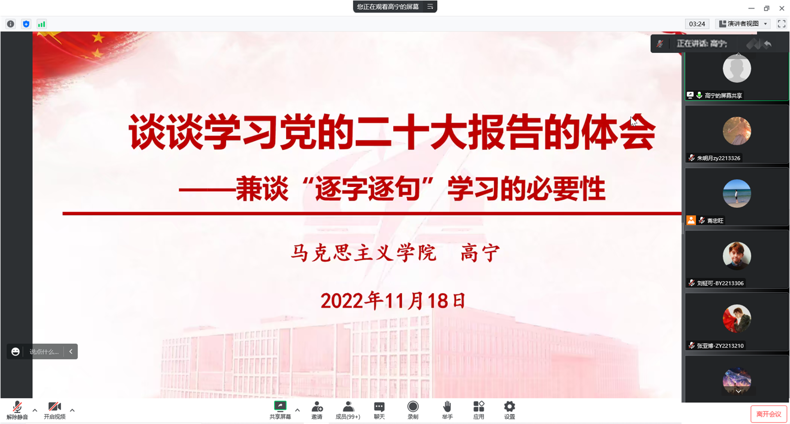 高宁教授开宗明义,以《中共中央关于认真学习宣传贯彻党的二十大精神的决定》为引,从“学原文悟原理”“认识报告权威性”两个角度详细介绍了“逐字逐句”的理论学习方法,并从“犯其至难而图其至远”和“致广大而尽精微”两个角度解读了党的二十大精神之“远”和“大”,强调学习领会二十大精神之“远”,应从党提出全面建成社会主义现代化强国、以中国式现代化全面推进中华民族伟大复兴的大背景为出发点,青年一代要清晰认识到自己所肩负的时代重任、历史重任,向着成为中华民族伟大复兴的生力军和顶梁柱而不懈努力奋斗;二十大精神之“大”,是我们党在干事创业中所凝练形成的成事之道,彰显了中国共产党在新时代、新征程上的大视野、大格局、大担当、大情怀、大战略。高宁教授指出,在学习党的二十大报告的过程中,要学会通过比较看创新、通过系统看贯通、通过拓展看内涵,注重学原文、读原著、悟原理,把握“国之大者”,学习理论创新,感悟思想逻辑,明确工作要求,践行伟大精神,立志做有理想、敢担当、能吃苦、肯奋斗的新时代好青年,让青春在全面建设社会主义现代化国家的火热实践中绽放绚丽之花。