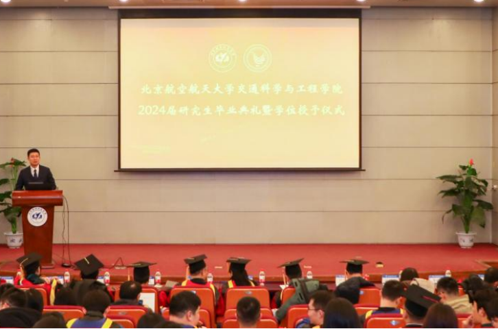 杨世春院长作开场致辞,代表学校和交通学院向顺利完成学业的毕业生们及亲友表示热烈祝贺。他带领同学们回顾了2024届毕业生自入学以来一路的成长和为学校学院发展建设做出的贡献,对同学们用自信自强、追求卓越的精神风貌书写的令人满意的青春答卷给予高度肯定,寄语毕业生们保持勇气、锐气和朝气,为实现中国式现代化和建设交通强国新篇章贡献北航青年力量。