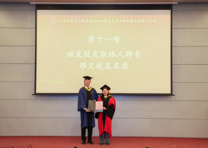 韩慧瑜书记向毕业生校友联络人颁发聘书,校友联络人代表也向学院移交了本次毕业的校友名录。
