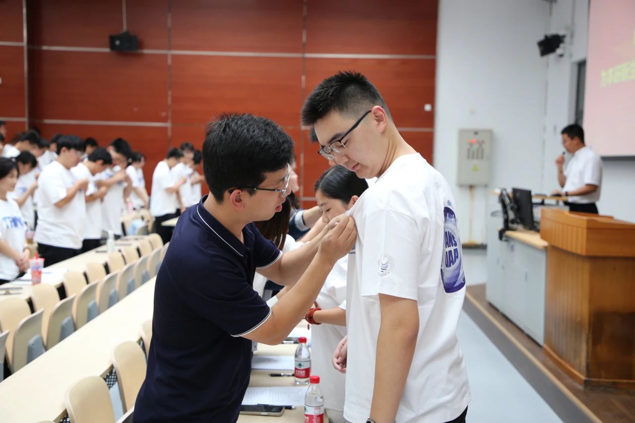 在庄严的国歌声中,典礼正式拉开序幕。学院领导老师为本研新生代表授予院徽,全体新生同步将院徽佩戴在胸前,标志着正式成为交通大家庭的一员。