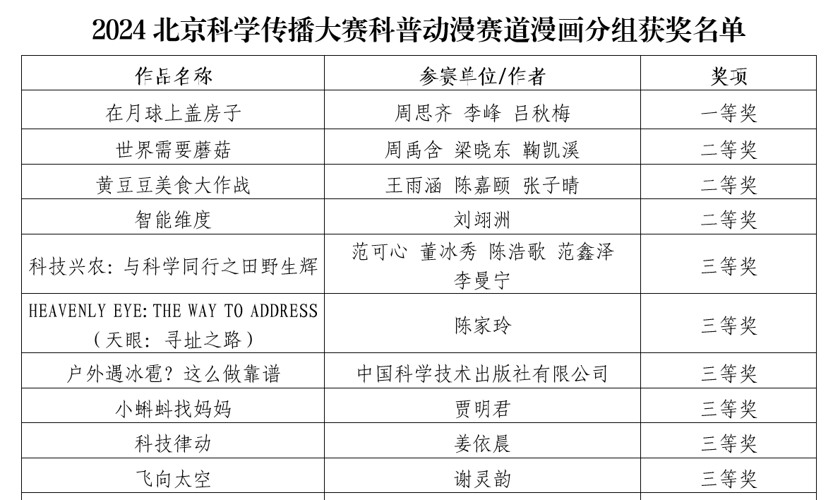12月22日,在北京广播电视台举办的2024北京科学传播大赛决出获奖名单。大赛设置科普动漫、科普文创、科普“讲·演”、科普视频四个赛道。其中,科普动漫赛道设动画组和漫画组,漫画组共决出一等奖1项、二等奖3项、三等奖6项、优秀奖32项。交通学院周思齐、李峰联合儿童画家吕秋梅老师共同申报的儿童科普绘本《在月球上盖房子》荣获2024北京科学传播大赛动漫赛道(漫画组)唯一的一等奖!此外,参赛作品《马督工的同学,在月球修路》荣获2024北京科学传播大赛科普视频赛道优秀奖。