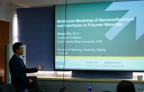 2018年12月 14日,应北航交通科学与工程学院谭力豪博士邀请,美国北达科他州立大学夏文杰助理教授参观北航土木工程实验室,并于下午 3:30‒5:00 在学院路交通学院西 501 会议室做了题为“预测性多尺度模型及对聚合物材料纳米限域与界面问题的研究”(Understanding Nanoconfinement and Interfaces in Polymer Materialsvia Predictive Multiscale Modeling)的学术报告。