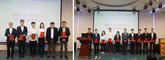 在接下来的奖学金颁奖典礼环节中,常熟汽饰诸位领导为获得2018-2019学年度常熟汽饰-北航之友奖学金的同学进行颁奖。本次奖学金收到了来自交通学院、材料学院、机械学院累计103名学生申请,经过层层筛选、优中选优,由奖学金评定委员会评选出包括在读博士、硕士研究生18名,本科生4名,共计22名获奖学生。奖项包括优秀研究生奖、优秀本科生奖以及优秀项目奖。最后颁奖嘉宾与获奖同学合影留念。
