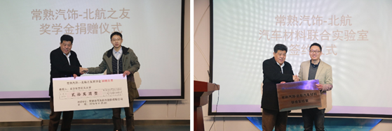 在常熟汽饰-北航之友奖学金捐赠仪式上,罗小春董事长代表常熟汽饰慷慨捐赠60万元设立常熟汽饰-北航之友奖学金(分三年,每年20万元),展现出常熟汽饰对高端人才的关爱之心;随后由罗小春董事长与许骏教授共同签署常熟汽饰-北航汽车材料联合实验室协议,宣告常熟汽饰-北航汽车材料联合实验室的正式启动。