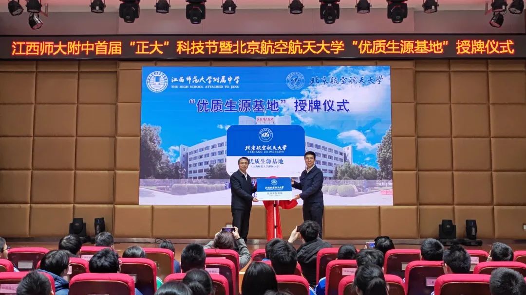 2月23日下午,招生组来到江西师范大学附属中学,双方深入交流了人才培养与校际合作等议题。在江西师范大学附属中学首届“正大”科技节开幕式上,江西研究院为同学们带来了精彩的无人机编队表演,激发了中学生的科技梦想;万志强教授现场为同学们进行了“空天强国,未来有我”主题讲座,系统介绍了各类航空器、航天器及其基本原理,引发了同学们对航空航天的浓厚兴趣;开幕式最后,在全体师生的见证下,双方共同为“优质生源基地”揭牌。